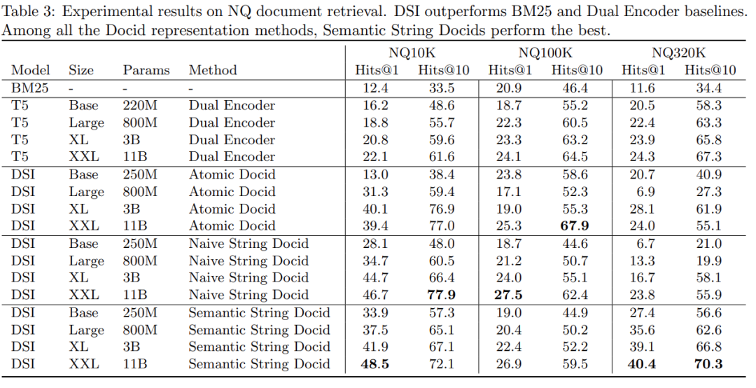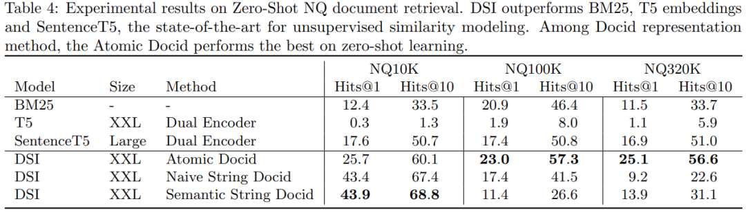 在适当的设计选择下,DSI 明显优于双编码器模型等强大基线,并且 DSI 还具有强大的泛化能力,在零样本设置中优于 BM25 基线