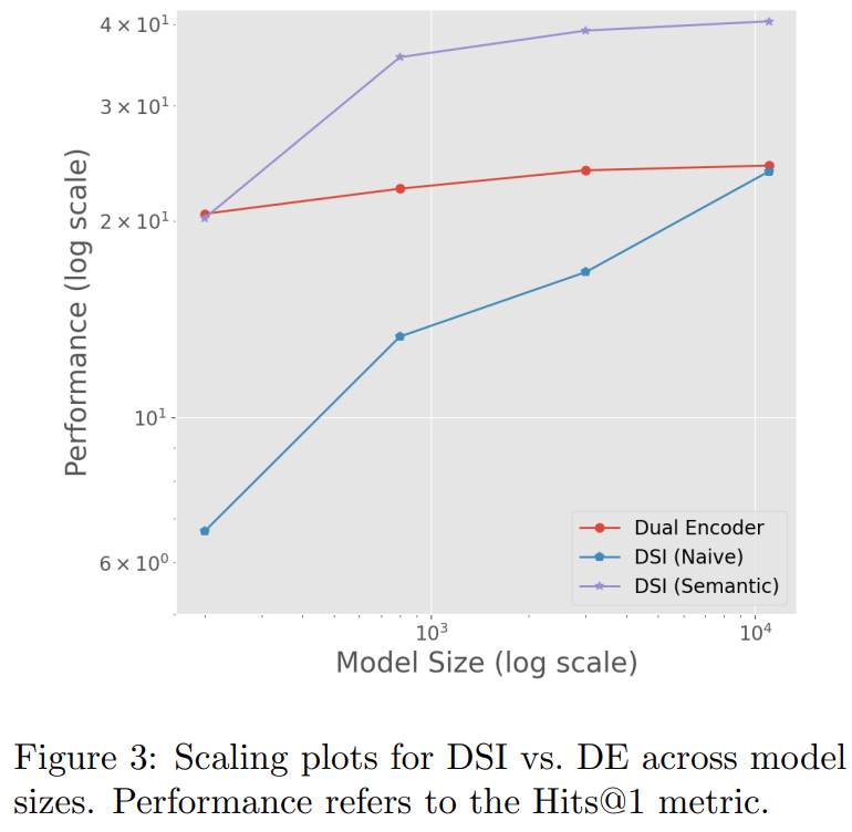 下图 3 绘制了三种方法的缩放表现(以对数尺度计),它们分别是 DE、具有 naive ID 的 DSI 和具有语义 ID 的 DSI。其中,DSI (naive) 可以从 base 到 XXL 的尺度变化中获益,并且似乎仍有改进的空间。同时,DSI (语义) 在开始时与 DE base 具有同等竞争力,但会随尺度增加表现得更好。DE 模型在较小的参数化时基本处于稳定状态。