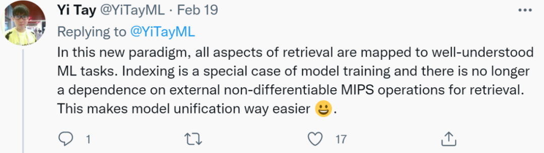 论文一作、谷歌高级研究员 Yi Tay 表示:在这个新范式中,检索的所有内容都映射到易于理解的 ML 任务上。索引是模型训练的一种特殊情况,不再依赖外部不可微的 MIPS 操作进行检索。这使得统一模型更容易。