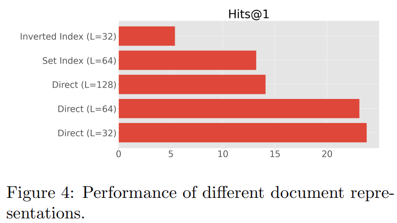 下图 4 给出了 NQ320K 上的结果。总的来说,研究者发现直接索引方法效果最好,并且由于 docid 反复暴露于不同的 token,因此很难训练倒排索引( inverted index)方法。他们还发现,较短的文档长度似乎在性能大幅下降超过 64 个 token 时效果很好,这表明当存在大量文档 token 时,可能更难优化或有效记忆。最后,研究者还发现对文档 token 应用集合处理或停用词预处理没有额外的优势。