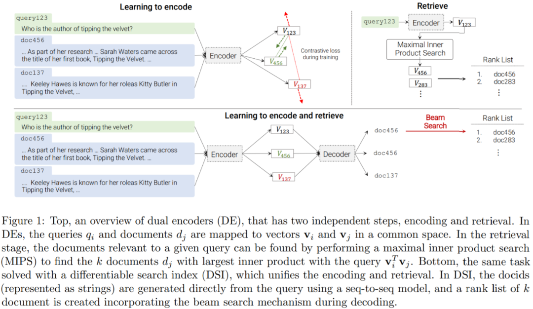 在这两个操作之后,DSI 模型可以用来索引文档语料库,并对可用的带标记数据集(查询和标记文档)进行微调,然后用于检索相关文档 —— 所有这些都在单个、统一的模型中完成。与先检索后排序方法相反,
