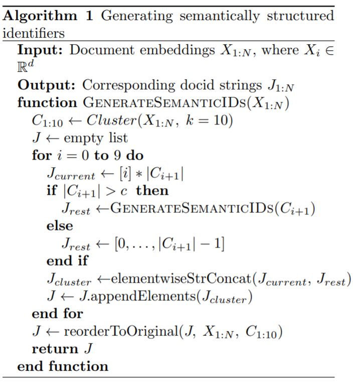 :其目标是自动创建满足以下属性的标识符:(1) docid 应该捕获一些语义信息,(2) docid 的结构应该是在每一个解码 step 之后有效地减少搜索空间。给定一个需要索引的语料库,所有文档都聚集成 10 个簇。每个文档分配有一个标识符,其簇的编号从 0 到 9。下表为这个进程的伪代码: