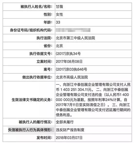 近日据北京市第三中级人民法院发布时间为2018年3月7日的执行信息显示,贾跃亭妻子甘薇应向浙江中泰创展有限公司支付人民币14.03亿元,支付按照年利率24%计算的违约金,以及迟延履行期间的债务利息,由于甘薇未能履行生效法律文书确定的义务,列入失信被执行人名单。