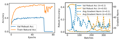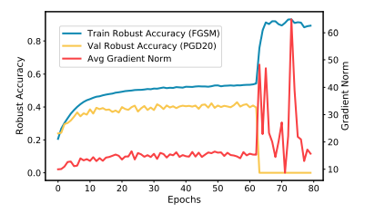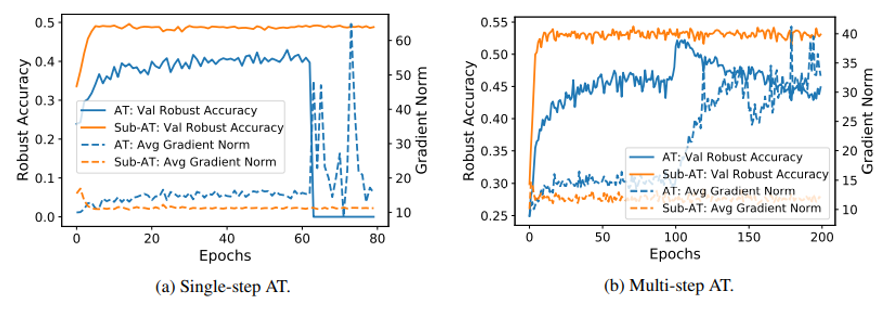 由于对抗样本学习的困难性,作者主要关注每个样本梯度的演化并通过平均梯度范数去分析模型的训练状态。作者主要在本文中去记录利用 fast 对抗训练方法去抵御 PGD-20 攻击的平均范数,可以发现当过模型的拟合现象出现时,平均梯度和准确率的会同时突然增大,这个现象也暗示着当模型的过拟合现象出现时,平均梯度范数会突然增大,导致神经网络在学习训练数据的过程中出现巨大的波动,从而导致模型的泛化能力下降。