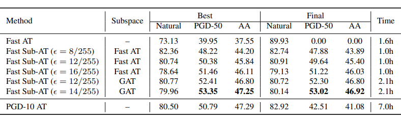 如下表所示作者总结了不同学习率的训练结果,并对应汇总了对抗训练的时间能耗。可以发现简单地通过增加训练步长和半径,子空间对抗训练可以显著提高模型对对抗攻击攻击的鲁棒性,而不会遭受灾难性的过度拟合或额外的时间开销,另外与 PGD-10 对抗训练相比,子空间对抗训练只需要总训练时间的七分之一,这是一个相当大的优势。