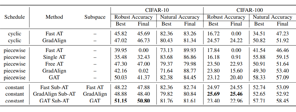 下表所示为不同对抗训练方法在 CIFAR-10 和 CIFAR-100 数据集上的结果。作者将子空间对抗训练方法应用于不同的基本对抗训练方法中,并从相应的训练轨迹中提取子空间。可以发现训练在 200 个的 epoch 的学习率下,Fast AT 和梯度截断 FGSM AT 仍然会遇到严重的灾难性过度拟合现象。在没有任何其他正则化技术的情况下,论文中提出的子空间对抗训练的方法可以使得模型获得更好的鲁棒性。
