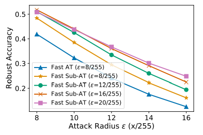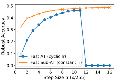 训练性能:如下图所示,子空间对抗训练可以很好将平均梯度范数数值在一个很低的区间里,这不仅可以有效地解决过拟合问题同时耶大大提高了模型的鲁棒性。另外,子空间对抗训练对模型学习率的选取也没有那么严苛,在一个较大学习率区间内模型学习都可以进行很好的收敛。