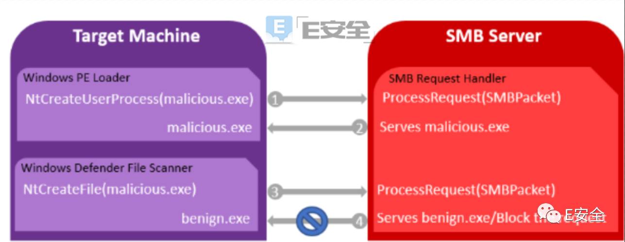 问题出现在用户双击该恶意文件之后。在默认情况下,Windows会从SMB服务器处请求一份文件副本用以创建该文件的执行进程,而Windows Defender也将请求一份文件副本来进行扫描。