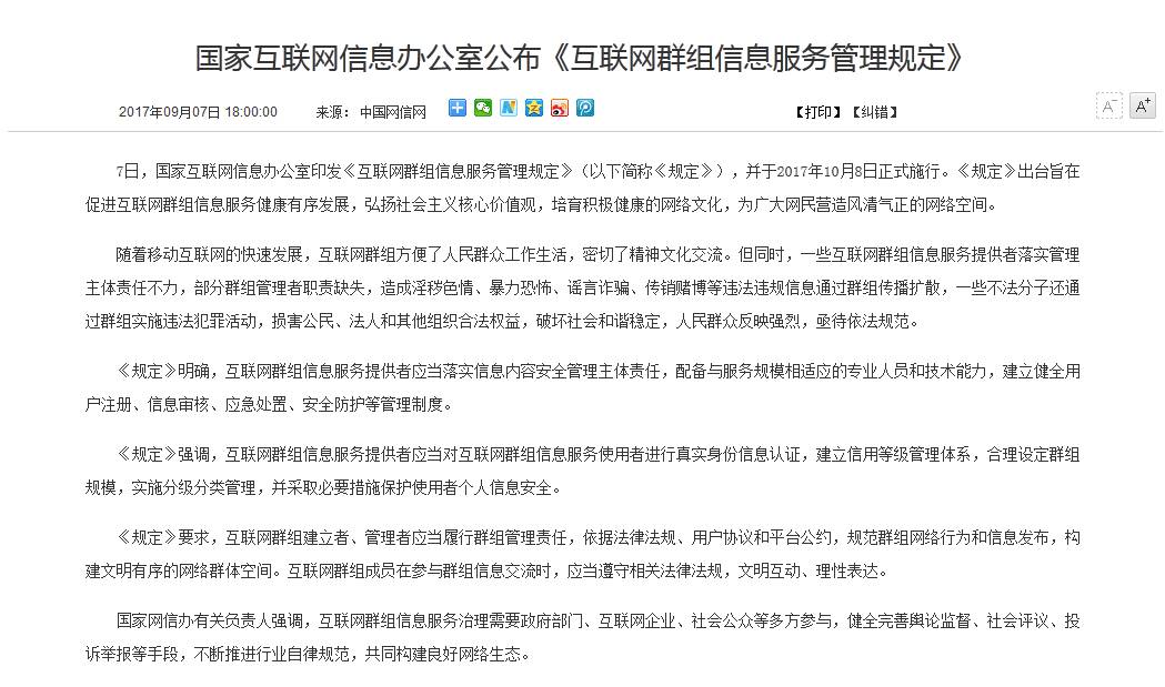 【TechWeb报道】国家互联网信息办公室昨日公布《互联网群组信息服务管理规定》(简称《规定》),并于2017年10月8日正式施行。