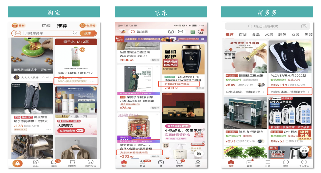 京东:“近期超千用户买过”+“为你探索的热搜商品”;同样是为了告诉用户这个商品是很多人共同的选择以及最近热门搜索的商品,你也可以尝试;