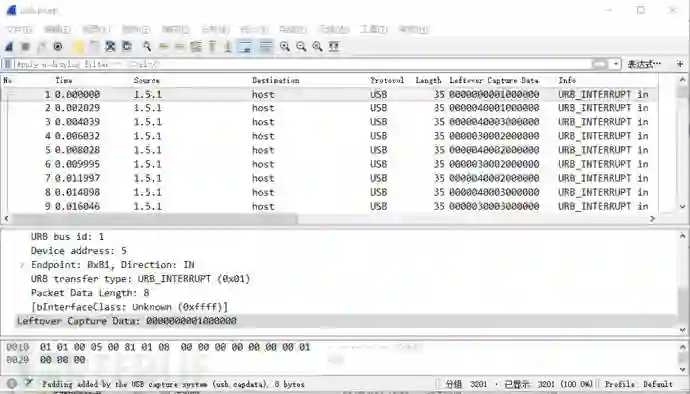 假设有一段流量,协议是usb,我用wiresharp打开这个包,可以看到里面的字段和内容: