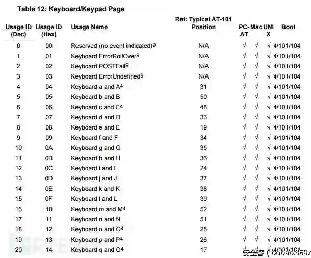 可以看出内容主要是Leftover Capture Data,首先要对usb协议进行分析,右键选项,然后点击应用为列,可以将该域的值在主面板上显示,usbkeyborad的数据包数据长度为8个字节,每两位是一个字节,而按键的数据都在第三个字节处,就是00、01、02、03…11、12、13、14,键位和HEX数值之间的对应关系如下图所示: