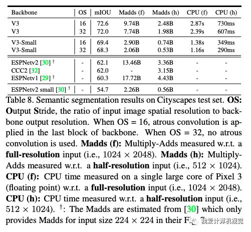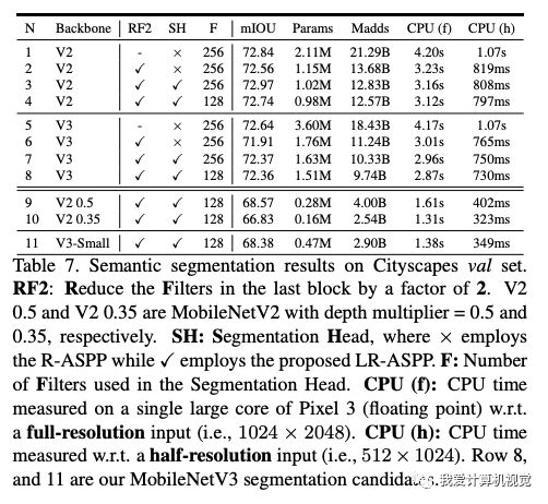 在Cityscapes语义分割任务中,新设计的模型MobileNetV3-Large LR-ASPP 与 MobileNetV2 R-ASPP分割精度近似,但快30%。
