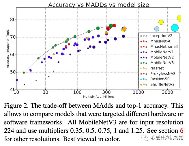 下图是ImageNet分类精度、MADD计算量、模型大小的比较,MobileNetV3依然是最优秀的。