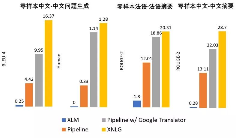 我们在跨语言零样本问题生成/文本摘要任务(用英文训练,在其它语言上测试)上进行了实验,如图5所示。结果表明,XNLG 可以超越基于机器翻译的流水线模型。