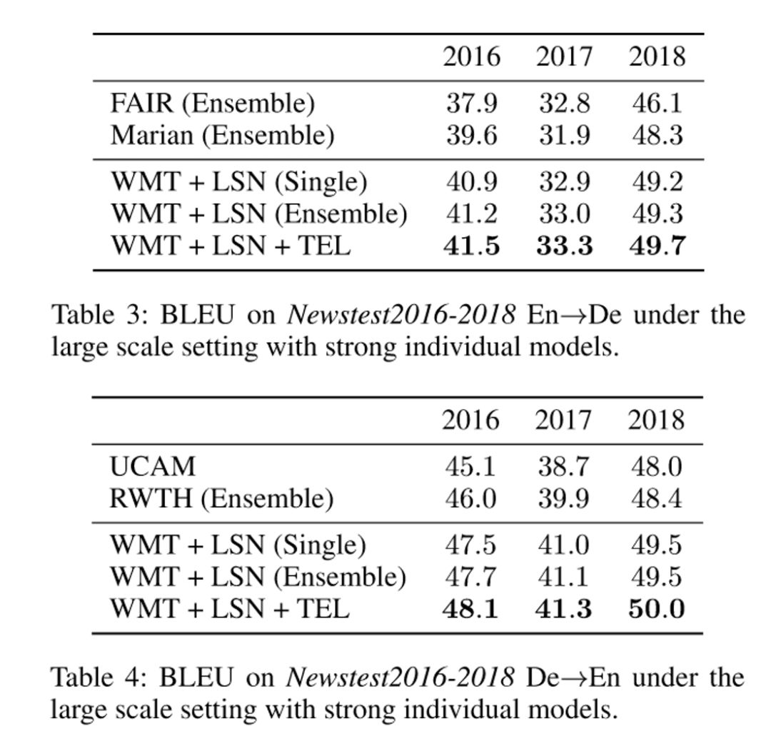 最后,我们使用了更大规模的无标数据,在 WMT 英德互译上取得了如下结果:
