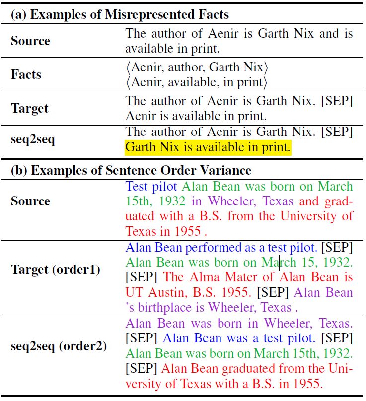 2. 由于从复杂句中派生出的多个简单句,可以以任何一种顺序方式呈现,这种排列的随机性会困扰 seq2seq 模型应该以怎样的顺序生成多个简单短句(如图7(b)所示)。