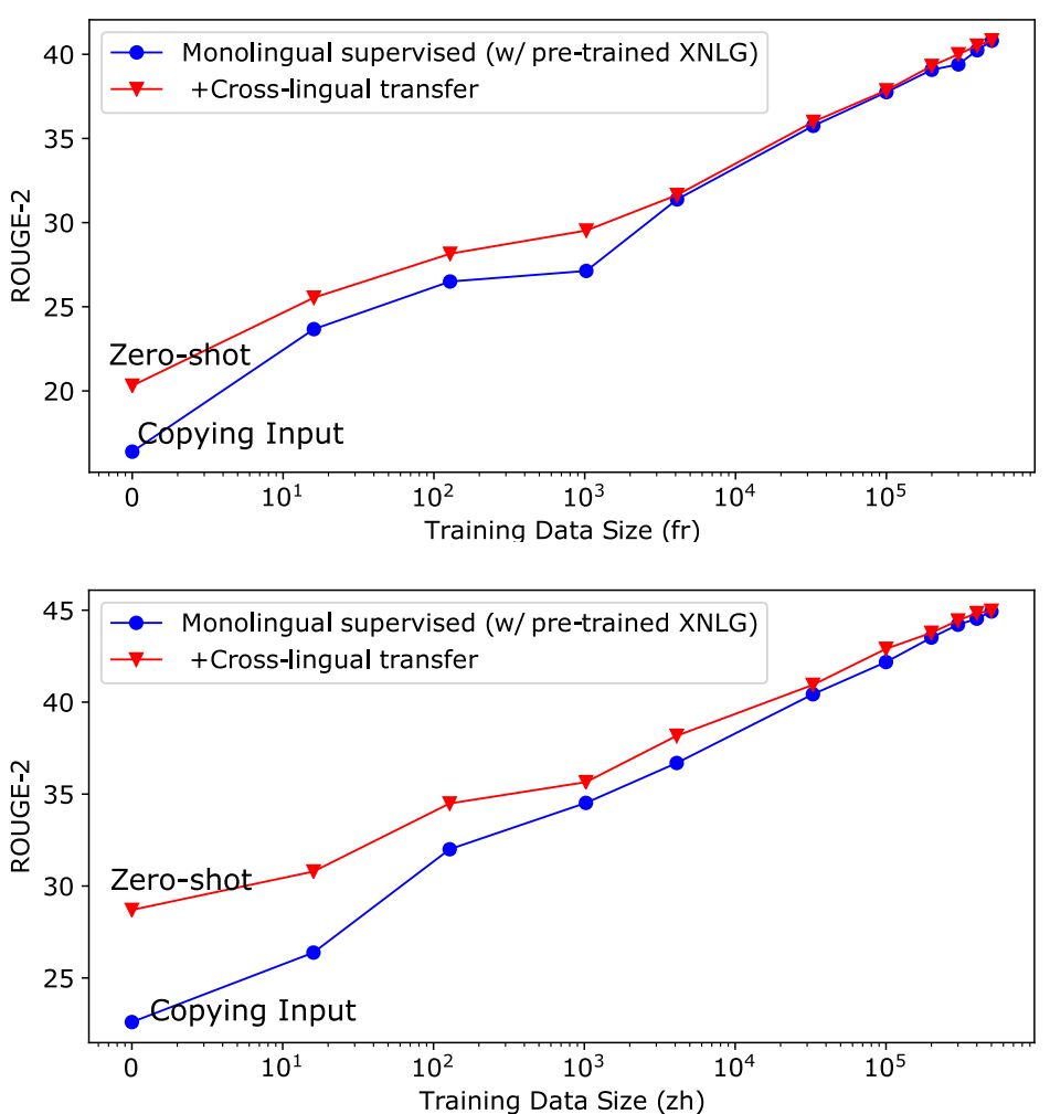 在自然语言生成模型的跨域语言迁移中, 通常模型用英语进行训练,然后在其它语言上进行测试. 以文本摘要为例: