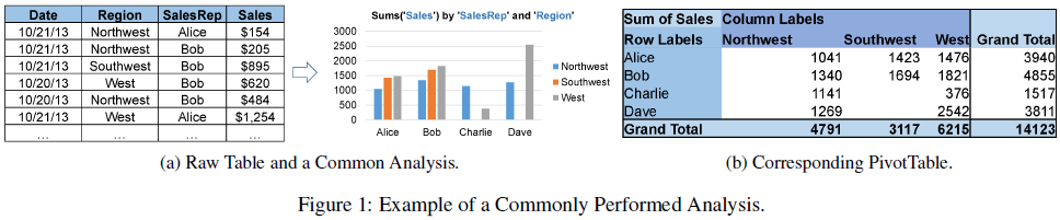 从科学研究探索到商业智能分析,在知识发现和决策自动化的过程中,我们常面对一个关键问题:对多维数据集(表格)进行分析时,大家通常如何从中提取出信息?譬如图11中的销售数据(有日期、区域、销售代表、销售额四个维度),大多数分析师会进行哪些常见的分析呢?对此,本篇论文提出了 Table2Analysis 框架,从大量 Excel 用户创建的(表格、分析)例子中学习普适的分析模式,并基于此对新的表格推荐语义上常见的数据分析。