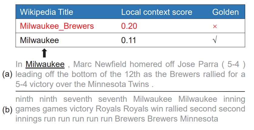目前一些先进的基于神经网络的实体链接模型容易将“提及”链接到类型不一致的实体上去。如图9所示,本篇论文的基线方法 DeepED(Ganea and Hofmann 2017)错误地将提及 “Milwaukee” 链接到球队类型的实体 Milwaukee_Brewers,尽管介词 “In” 明显地暗示 “Milwaukee” 应该指代地点类型的实体 Milwaukee。