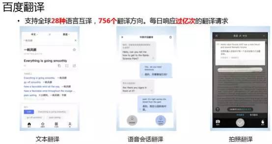 到目前为止,我们讲的都是一种语言,都是中文,但“百度翻译”是解决多语言问题的,在 28 种语言之间互译,互译的方向大概是 700 多个,每天有过亿次的翻译请求。同时也结合了语音技术、视觉技术,延伸出了语音会话翻译、拍照翻译等等应用。