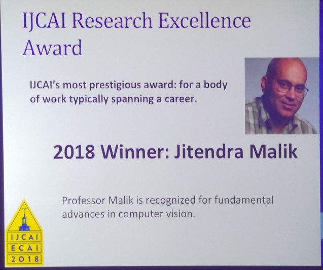 说完最佳论文,再来看其他奖项。IJCAI的奖项是任何AI研究人员可获得的最高荣誉之一。IJCAI 2018奖项设置分为:卓越研究奖(Research Excellent Award)、计算机与思想奖(Computer and Thought Award),以及约翰麦卡锡奖(John McCarthy Award)。