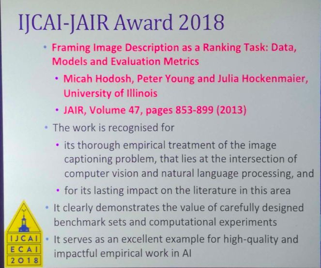 今年的 IJCAI-JAIR 奖颁发给了伊利诺伊大学 Micah Hodosh, Peter Young & Julia Hockenmaier 发表于2013年的一篇论文《将图像描述作为排序任务:数据、方法和评估指标》。该论文的获奖理由如下: