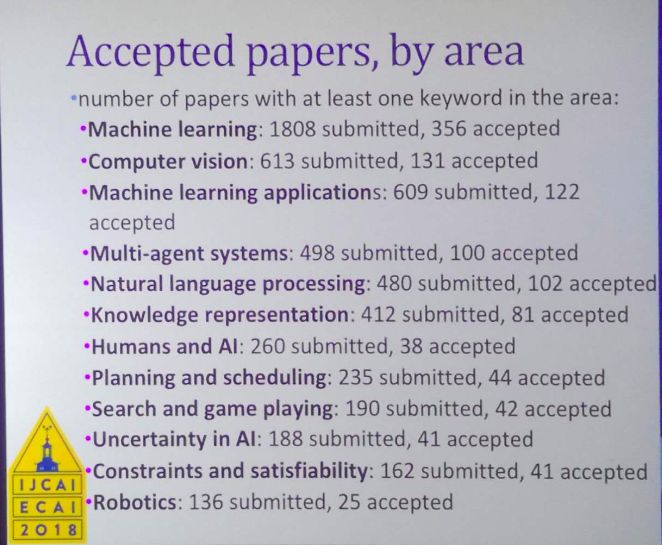 得益于近年来AI的热度,今年的IJCAI也是有史以来规模最大的一届,有2500人参会。同期联合举行的还有AAMAS,ICMAL,ICCBR和SoCS。加上此前的ICML,将各种参会人数统合起来,一共有7500人参加了这次斯德哥尔摩的AI盛会。