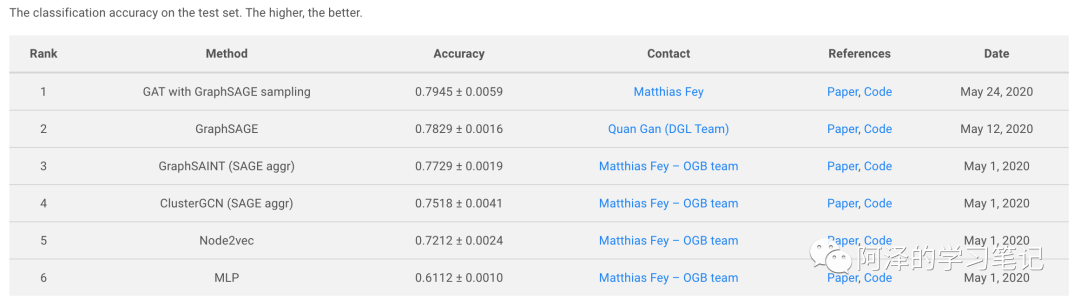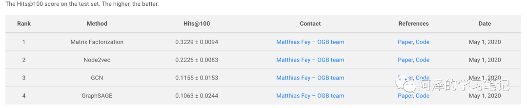 OGB 也提供了标准化的评估人员和排行榜,以跟踪最新的结果,我们来看下不同任务下的部分 Leaderboard。