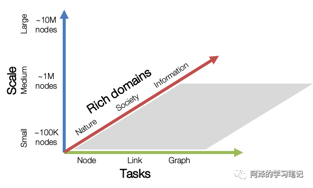 下图展示了 OGB 的三个维度,包括任务类型(Tasks)、可扩展性(Scale)、领域(Rich domains)。