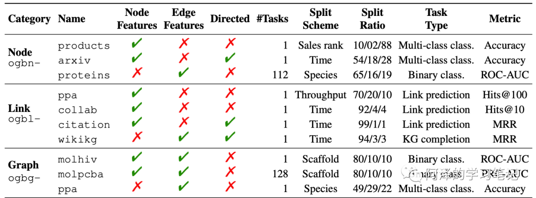 OGB 包含了多种图机器学习的多种任务,并且涵盖从社会和信息网络到生物网络,分子图和知识图的各种领域。没有数据集都有特定的数据拆分和评估指标,从而提供统一的评估协议。