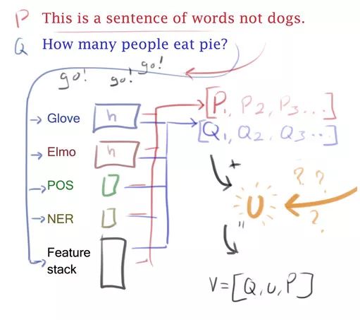 在这里,这些模型会得到所有这些巨大的嵌入的堆栈,它们将为文章中的每一个单词计算一次这样的嵌入,再为问题中的单词也计算一次。它们最后会通过另一个随机向量u的简单连接将这些嵌入结合在一起。从而得到:V=[Q,u,P]