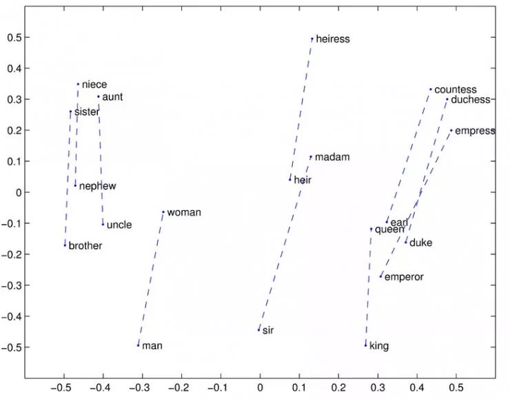 使用 skip-gram 或 cbow 方法的 word2vec(https://code.google.com/archive/p/word2vec/ )模型能够执行一些有一定规律可循的向量操作。例如(以下均为嵌入向量的计算):「国王」 - 「男人」+ 「女人」得到的向量与代表「女王」的向量非常相近。