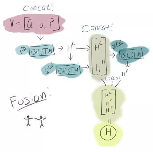 为了模糊化问题、向量 u、文章之间的信息,他们将向量 V 作为一系列双向 LSTM 的输入。