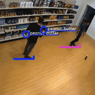 当你走进Standard Cognition的商店时,你可以直观地看到这些技术。商店的一面墙上挂了一个大的显示器,显示着商店内的实时视频。如上图所示,每个人都有不同颜色的标记,无论什么时候你拿起东西,它都会在屏幕上显示一个圆圈和一个标签。