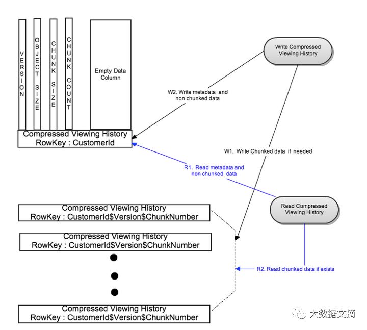 通过关键字CustomerId首次读取元数据行。对于常见用例,块数为1,元数据行也具有最新版本汇总起来的压缩观看记录。对于不常见的用例,有多个压缩的观看记录数据块。使用版本号和块数等元数据信息生成块的不同行密钥,并且并行读取所有块。上述方法将读取延迟限制为两种读取。
