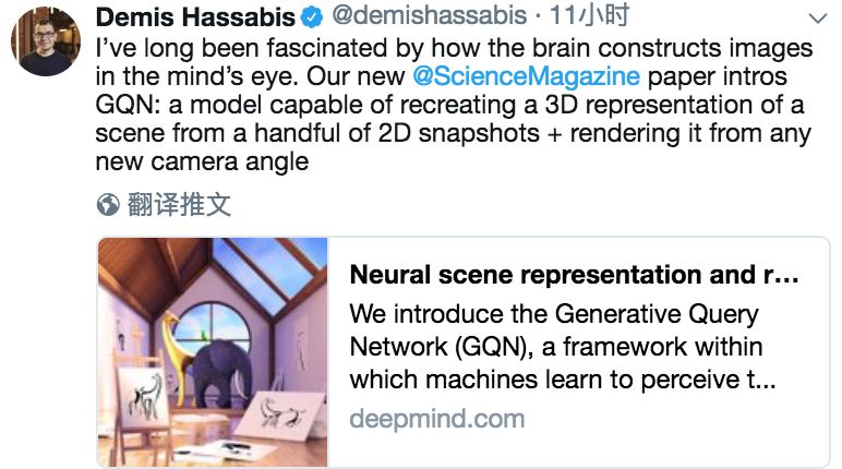 想想是不是有点激动,DeepMind创始人哈比萨斯也一样,今天他也难得发推特,介绍了这一成果:我一直着迷于大脑如何在大脑的眼睛中构建图像。我们新推出的Science论文介绍了GQN:一种新模型,能够从一些2D快照中重新创建各角度3D场景。