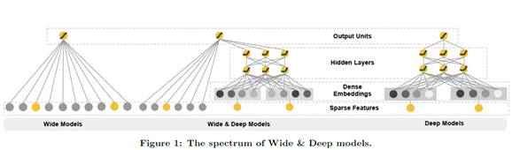 本文是将Wide Models(Figure1,最左侧) 与 Deep Models(Figure1, 最右侧) 进行联合训练,保证记忆能力与泛化能力的均衡, 提出Wide&Deep(Figure1, 中间)。