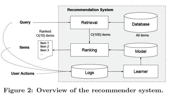 推荐系统主要由Retrieval System与Ranking system两部分组成。输入query,是用户信息与上下文信息构成的特征,输出则是经过推荐模型排序的条目列表。