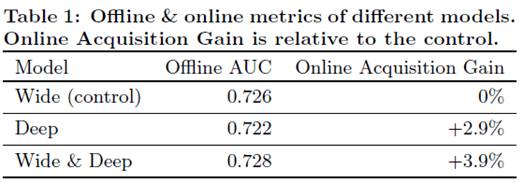 app acquisitions:通过对1%的a线上用户进行A/B testing,Wide&Deep效果明显, 线下实现效果提升不大的原因可能是线下的实验数据是固定的, 限制了模型的泛化能力。实验效果见Table1: