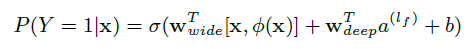 其中,Y 是二值类标签,表示用户是否下载app的行为。为sigmoid函数, 为Wide Component中构造的cross-product transformation,x为app item对应的原始特征,b为偏置。Wwide 与 Wdeep分别为两个模型的参数向量。