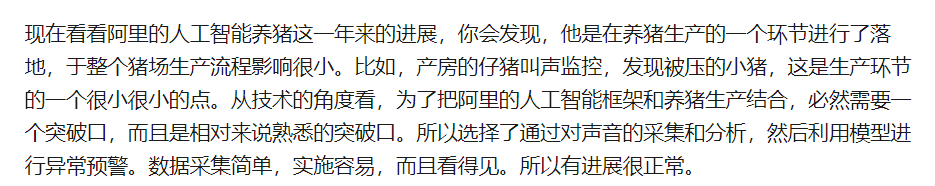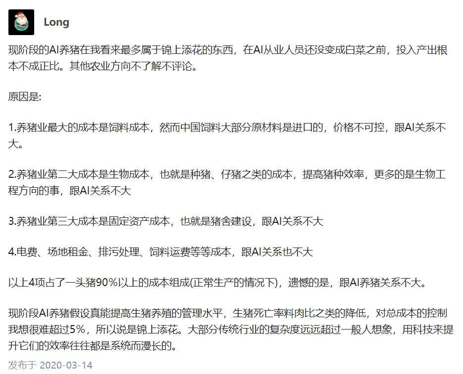 大家质疑的点主要在于,首先,在养猪行业加入 AI 到底有没有解决养猪的痛点?从目前的进展来看,阿里、京东以及上文介绍的论文作者都聚焦于用成熟的计算机视觉等技术来改善传统养猪行业的某个流程。但有人指出,他们所解决的可能并不是根本问题,而与该行业成本息息相关的饲料成本、生物成本、固定资产成本等问题其实跟 AI 关系不大。因此,AI 只是起到了一个锦上添花「可有可无」的作用。