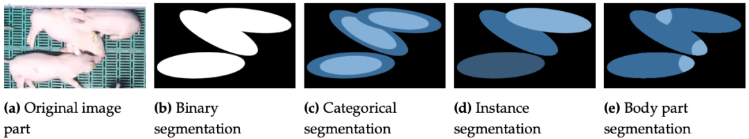 论文所提方法的目的是:使用安装在猪圈上方的摄像头采集图片,之后对图片中所有的猪进行全景分割。全景分割是语义分割与实例分割的结合,其中语义分割将背景与猪区分开来,实例分割用于区分不同个体的猪,如下图所示。