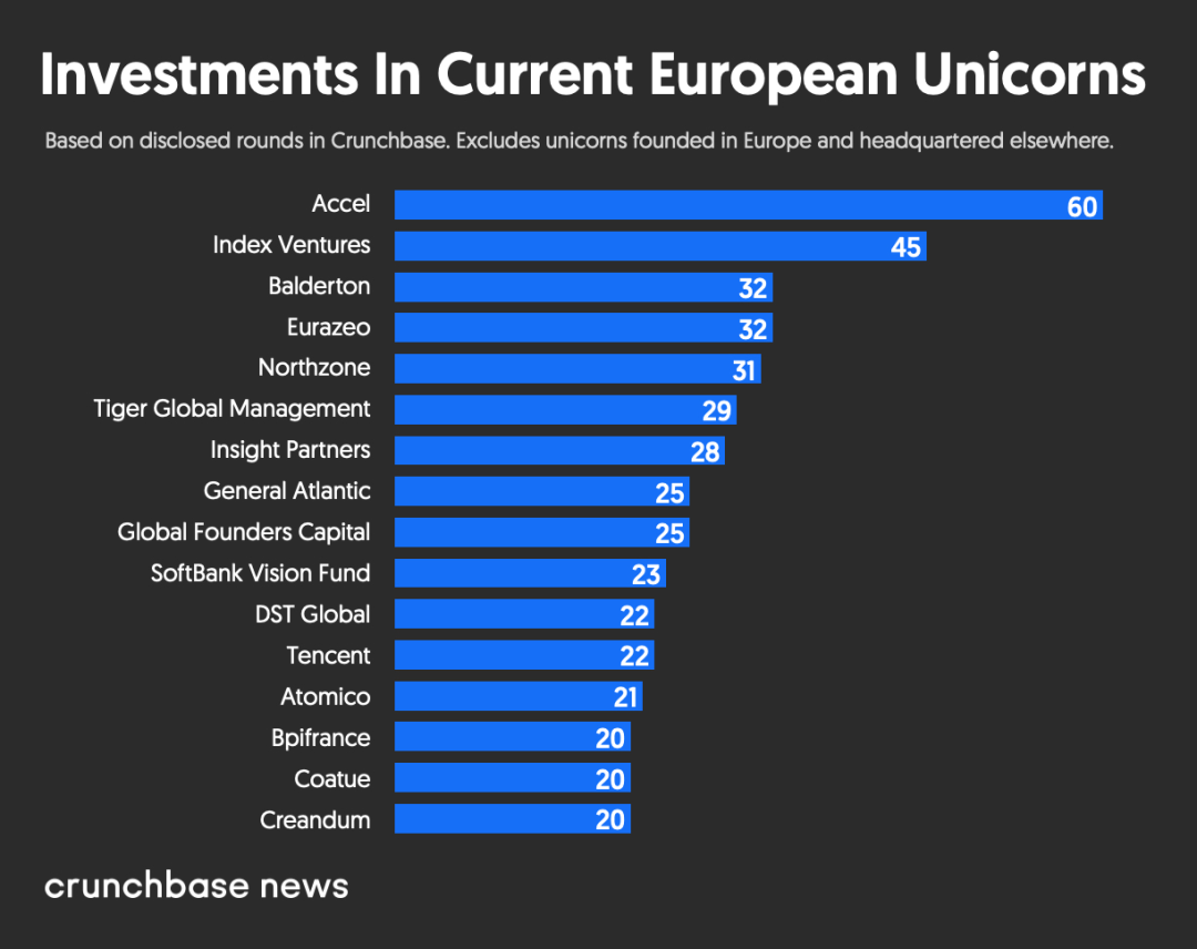 Crunchbase 曾以投资数量统计欧洲独角兽的活跃投资方,美国风投 Accel 和 Index Ventures 遥遥领先,对欧洲独角兽企业的投资数量分别为60和45。其他活跃投资方还包括英国的 Balderton Capital 、法国的 Eurazeo (投资数量均为32笔)、英国的 Nortzone (31笔)等等。