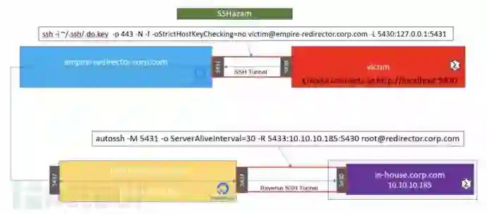 C2连接通过SSH隧道转发到empire-redirector。empire-redirector上的防火墙规则将流量转发到另一个中间重定向器。最后,Empire C2会话最终登陆的内部系统会建立与最终重定向器的反向SSH连接。