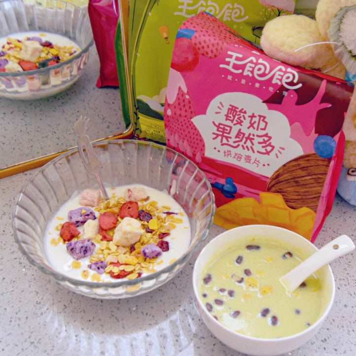“酸奶多麦片,里面满满都是酸奶块还有水果干,这个麦片是不加糖的,除了泡牛奶、干吃,还可以泡酸奶......特别脆,很好吃。”这段时间,一个名为王饱饱的代餐品牌以全网刷屏的方式闯入微胖女孩张琦的视野。