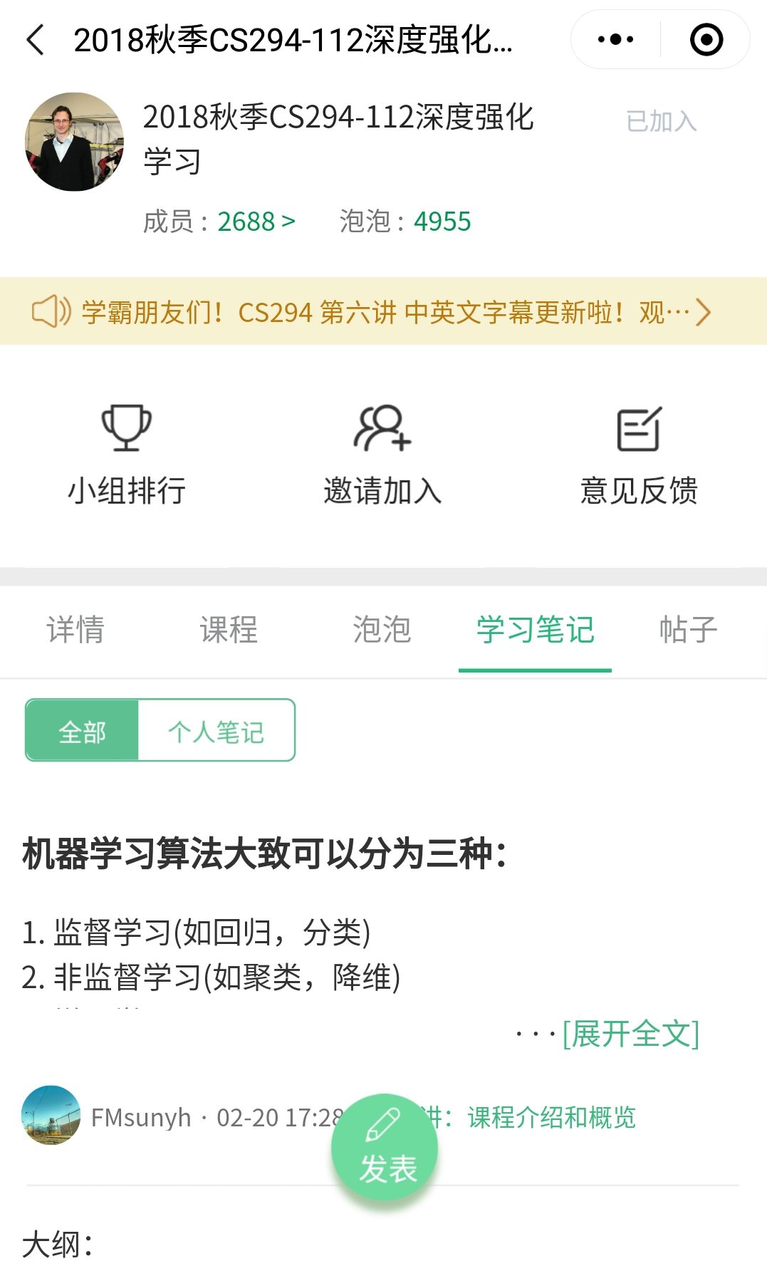 点开小组小程序,加入2018秋季CS294-112深度强化学习小组