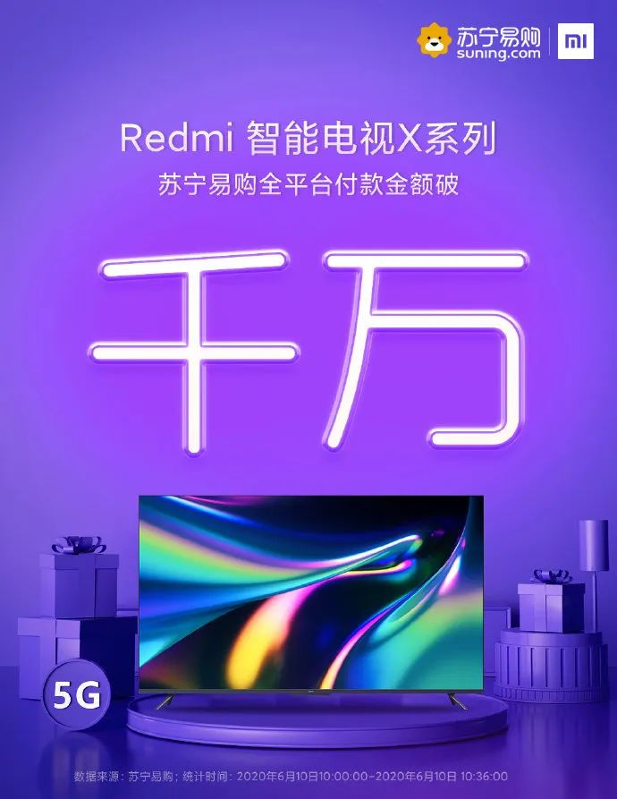 Redmi 智能电视 X55/X65 今日在各大电商平台开售,9 分 28 秒全渠道销量破万台。在苏宁易购平台上付款金额破千万。