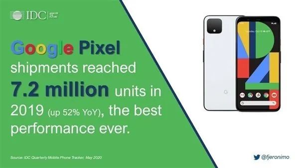 IDC 发布报告 2019 年谷歌 Pixel 系列手机出货量为 720 万部,相比2018 年增长了 52%,创造该品牌历史最好的销量成绩,且其出货量更是超过了一加手机。