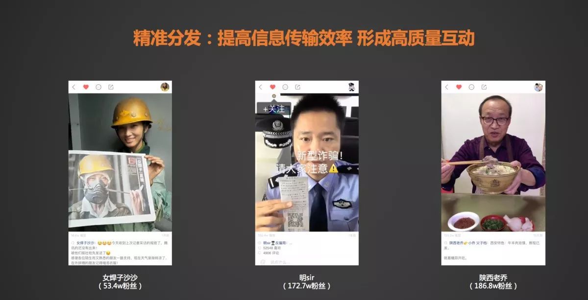 第二位叫做明sir,明sir是一位金城派出所的民警,我们专门去派出所认证过真实性,过去他教邻居们、大爷大妈们怎么防诈骗,后来有一天他发现有快手的用户喜欢这样的内容,他把新的诈骗方法,用他的识别方法做成一个十秒的短视频快速介绍给大家,让网友们减少被骗的概率,很快帮助他在快手上赢得170多万粉丝,在今年还收获了公安部的嘉奖,作为基层的民警能够懂得用互联网的方式更好帮助老百姓,这是非常有意思的一件事情。